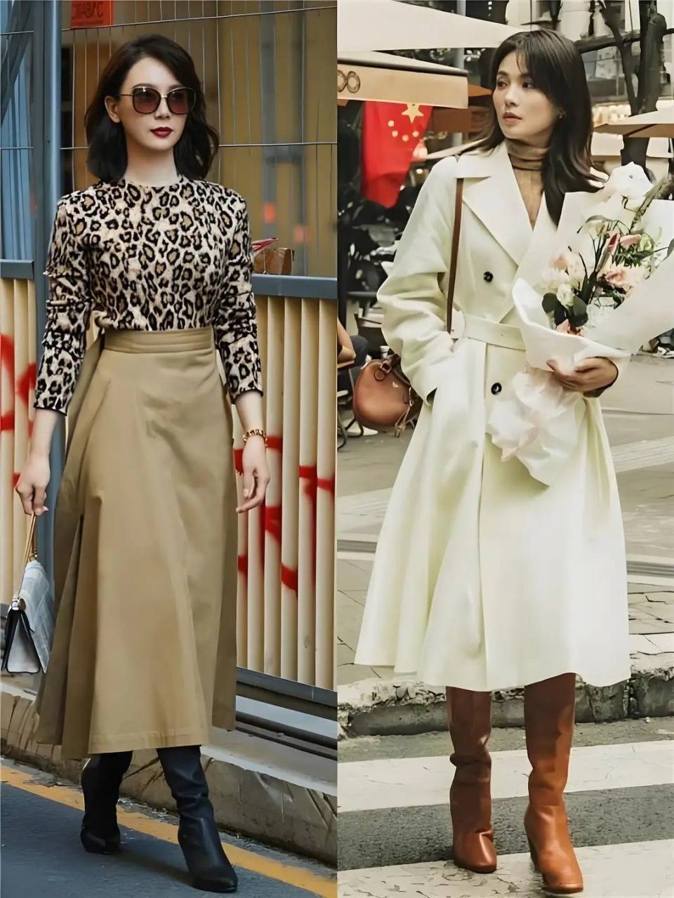 当然啦,如果你身材管理很好,就算是像陈数一样,到了奔五的年龄,也可以选择豹纹的上衣来搭配上卡其色的a字半身裙,脚上穿的一双黑色的中筒靴,这样的“繁简结合”穿搭会显得更时尚,更个性。