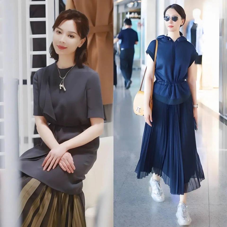陈数是选择了杏色 V领衬衫,搭配上卡其色的百褶半身裙,这样的搭配会显得比较成熟稳重,呈现出这个年龄段该有的女性魅力。