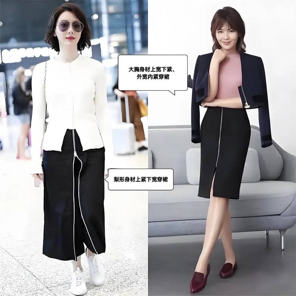 还要根据自己的身材比例,选择适合自己的穿搭方式,比如说大胸身材要选上宽下紧的搭配,比如刘涛这一件短外套,再搭配上粉色的修身针织上衣和一条高腰收腰款的黑色直筒半身裙,就能很好的展现出她比较凹凸有致的身材。