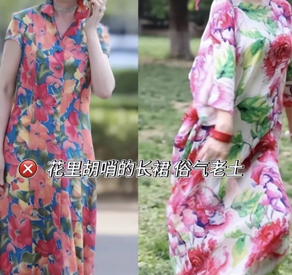 更别提下面这种花里胡哨的长裙了,可能你看到这种裙子挂在服装店的时候看起来挺好看,但上身效果实际情况俗气老土。